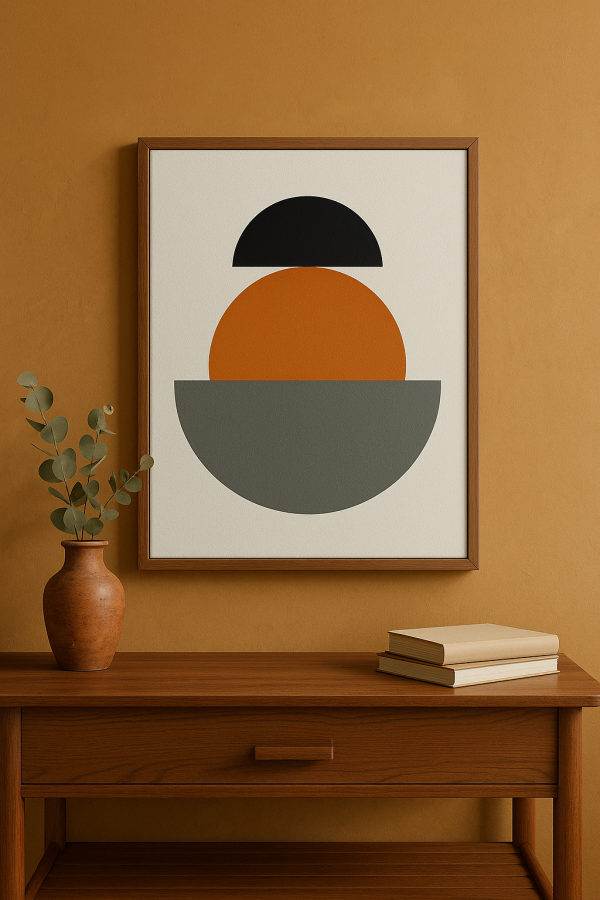 Ce tableau moderne présente un design géométrique épuré, composé de trois formes semi-circulaires superposées. En bas, un demi-cercle gris aux tons neutres sert de base solide, symbolisant la stabilité et le calme. Au centre, une demi-sphère ocre apporte une touche chaleureuse et vibrante, évoquant la terre ou un coucher de soleil apaisant. Enfin, en haut, une demi-sphère noire tranche avec force et élégance, apportant un contraste graphique fort. Le fond blanc immaculé met en valeur ces formes simples, renforçant l’impression de pureté et de sophistication. Ce tableau invite à une contemplation zen, un équilibre subtil entre forces opposées et harmonieuses, parfait pour insuffler une ambiance sereine et raffinée dans n’importe quel espace. Le style minimaliste et contemporain de cette création graphique trouve idéalement sa place dans une décoration intérieure moderne, épurée ou scandinave. Il peut aussi séduire les amateurs d’art abstrait et conceptuel qui apprécient la simplicité puissante des formes élémentaires. Plus qu’un simple objet décoratif, ce tableau inspire la concentration, la paix intérieure et l’esthétique raffinée. Un cadeau original et tendance à offrir pour embellir un salon, un bureau ou une chambre, en y apportant une touche artistique et sophistiquée.