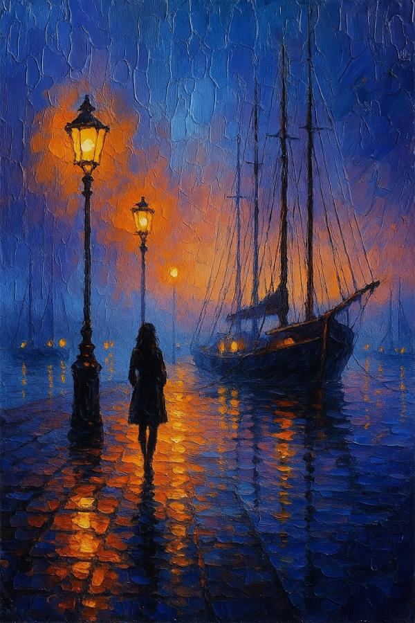 1. Description artistique (≈ 120 mots) : Cette œuvre immerge le regard dans une scène portuaire nocturne, où un quai pavé se pare de reflets orangés et bleutés. Deux lampadaires diffusent une lueur chaude qui danse sur l’eau calme, tandis qu’une silhouette féminine avance vers un voilier amarré. Le contraste entre les teintes bleu canard profondes et les halos dorés crée une atmosphère mystérieuse et poétique. Les coups de pinceau subtils suggèrent la texture des pavés et la brume légère au-dessus de l’eau, donnant au tableau une dimension presque onirique.