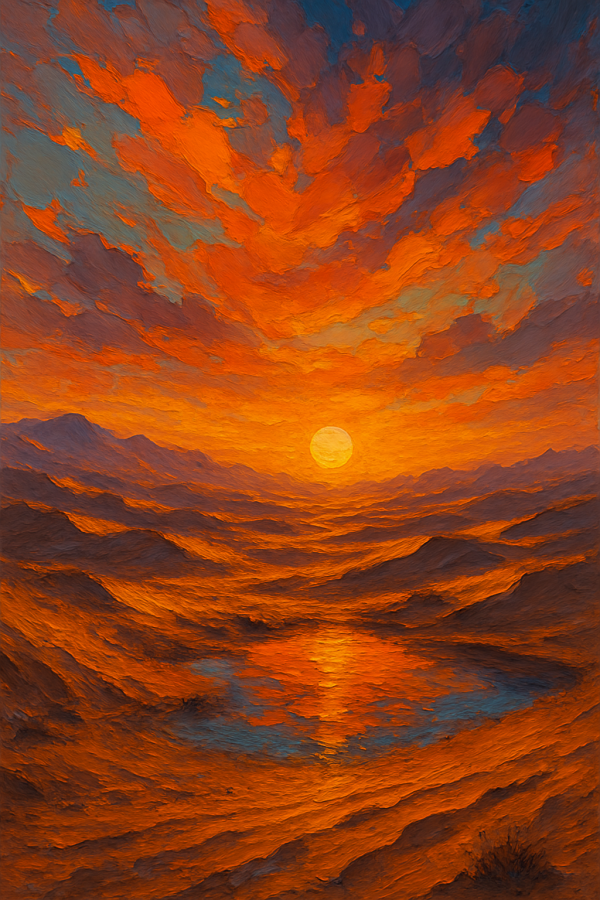 **1. Description artistique (≈ 120 mots)** : Cette œuvre déploie un horizon infini baigné de nuances chaudes orangées, rougeâtres et dorées qui évoquent un coucher de soleil embrasant des collines ondulantes. Le centre du tableau révèle un soleil flamboyant dont la lueur se reflète sur un plan d’eau miroitant, créant un sublime jeu de lumière aux reflets ambrés. Les nuages, en volutes vaporeuses, apportent une dimension onirique et apaisante. Le style rappelant un tableau impressionniste joue sur le contraste des couleurs chaudes et froides pour instaurer une profondeur presque tactile. L’ensemble respire la sérénité, invitant à la contemplation et à la détente.