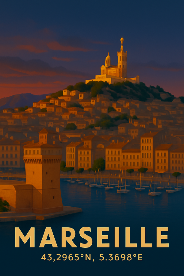 Cette affiche captivante capture la beauté emblématique de Marseille au coucher du soleil, baignant la ville dans une lumière dorée et chaleureuse. Les tons chauds d’ocre et d’orange contrastent élégamment avec le bleu profond du ciel et de la mer, créant une atmosphère à la fois nostalgique et reposante. Le style artistique s’inspire des affiches vintage de voyage, avec des formes simples et des contours doux qui mettent en valeur la silhouette reconnaissable de la basilique Notre-Dame de la Garde perchée au sommet de la colline, ainsi que les maisons typiques et les voiliers paisibles sur l’eau. En bas, le nom « MARSEILLE » est écrit en lettres capitales audacieuses, accompagné des coordonnées géographiques précises, ajoutant une touche personnalisée et authentique. Ce tableau invite à un voyage imaginaire vers la Méditerranée, où l’air salin, les ruelles anciennes et la douceur du crépuscule promettent une parenthèse enchantée et apaisante. Parfait pour créer une décoration tendance et élégante, cette création artistique évoque à la fois aventure et détente dans un univers chaleureux. Ce tableau est une idée de cadeau originale pour tous les amoureux de la mer, du voyage, et des villes françaises au charme intemporel.