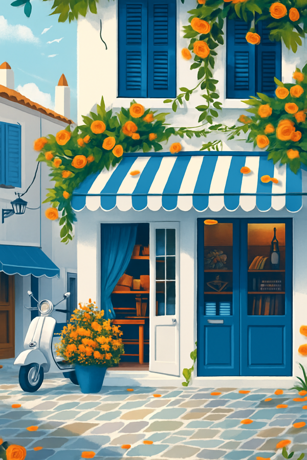 Cette illustration charmante capture l’essence d’une ruelle méditerranéenne baignée de lumière naturelle, où la fraîcheur des volets bleus contraste parfaitement avec la blancheur éclatante des murs. Au premier plan, un scooter blanc vintage est stationné sur un pavage aux teintes douces, ajoutant une touche de nostalgie et de calme à la scène. Autour, des pots débordants de fleurs oranges vives s’entrelacent avec délicatesse, suspendus et parsemés au sol, insufflant vie et chaleur à cette atmosphère paisible. La véritable magie réside dans un cadre accroché au mur, reflétant l’image même du décor dans un effet d’infini hypnotisant, offrant une profondeur envoutante et une invitation à l’évasion. Ce tableau mêle réalisme et poésie dans un style élégant et moderne, rendant hommage à l’art de vivre méditerranéen et capturant une sérénité douce, presque suspendue. Idéal pour une décoration murale qui transporte, ce visuel inspire la détente, la douceur de vivre et une invitation à la flânerie. Parfait pour embellir un intérieur à la recherche d’une ambiance chaleureuse, provençale et authentique, ce tableau évoque des émotions de nostalgie heureuse et d’émerveillement. Une œuvre décorative idéale comme cadeau original personnalisé ou pour instiller une touche de nature et de voyage au cœur de sa maison.