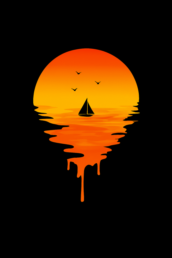 Ce tableau captivant présente une scène minimaliste d’un coucher de soleil stylisé, où un grand disque solaire dégradé du jaune vif à l’orange intense domine le centre. La surface de l’eau est représentée par des ondulations abstraites qui semblent fondre et couler vers le bas, comme de la peinture fraîche qui dégouline, apportant une touche artistique et originale à l’ensemble. Un petit voilier noir se détache en silhouette sur l’horizon, accompagné de trois oiseaux en vol gracieux, symbolisant la liberté et l’évasion. L’arrière-plan totalement noir met en valeur les couleurs chaudes et vibrantes, créant une ambiance à la fois moderne et apaisante, idéale pour un intérieur contemporain. Cette œuvre évoque un univers onirique où le temps semble suspendu, invitant à la rêverie et à la contemplation profonde. L’image suscite des émotions de calme, de douceur et de voyage intérieur, parfait pour apporter une touche de poésie et de mystère à un espace de vie ou de travail. Parfait pour les amateurs d’art minimaliste, de nature stylisée, et d’ambiances chaleureuses, ce tableau original est un cadeau de décoration tendance qui invitera à la détente et à l’inspiration. Un choix idéal pour ceux qui recherchent une décoration murale à la fois moderne, esthétique et pleine de sens, à afficher fièrement dans un salon, bureau ou chambre à coucher.