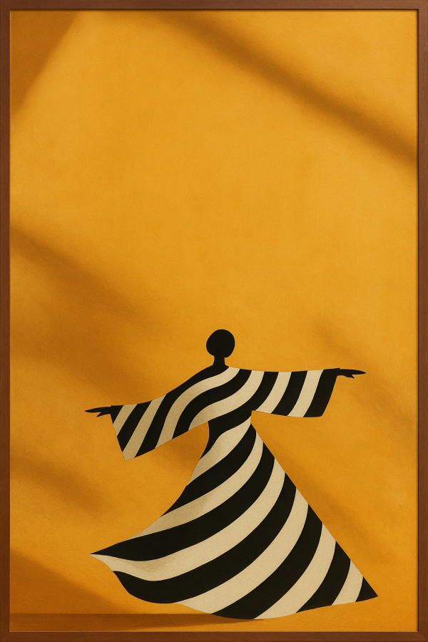 Ce tableau captivant présente une silhouette abstraite en mouvement, évoquant la danse, sur un fond ocre chaud et intense. La figure féminine stylisée, uniquement suggérée par une forme noire simplifiée, porte une robe aux larges rayures ondulantes noires et crèmes, qui capturent le mouvement fluide et gracieux. Les couleurs contrastées entre le fond ocre lumineux et les lignes graphiques créent une ambiance à la fois dynamique et chaleureuse, empreinte de modernité et d’élégance. L’œuvre évoque une histoire où la liberté d’expression et la beauté du mouvement s’entremêlent, invitant à une immersion dans un univers contemporain où l’art minimaliste révèle la puissance du geste et la poésie visuelle. Son style épuré et graphique fait de ce tableau un élément décoratif parfait pour des intérieurs design, minimalistes et modernes. Il inspire des émotions de légèreté, d’optimisme et de créativité, transformant chaque espace en un lieu stimulant et accueillant. Cette œuvre unique séduira les amateurs de décoration tendance à la recherche d’un cadeau original et personnalisé autour du thème de la danse, du mouvement et de l’art abstrait.
