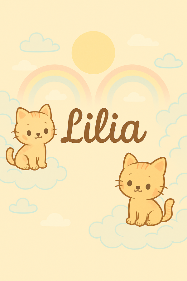 Ce tableau doux et tendre, spécialement conçu pour une chambre d’enfant, dégage une atmosphère chaleureuse et apaisante. Sur un fond crème, deux adorables chatons aux traits arrondis et expressifs semblent flotter sur de moelleux nuages bleu pastel, entourés de petits nuages et deux arcs-en-ciel discrets aux teintes pastel. Un grand soleil jaune pâle s’élève au centre, apportant une sensation de calme et de sérénité. Le nom « Lilia » est inscrit en lettres brunes arrondies au centre, personnalisant la décoration avec délicatesse. L’ensemble du visuel est réalisé dans un style enfantin, kawaii et minimaliste, idéal pour éveiller la tendresse et stimuler l’imagination d’un jeune esprit. Ce tableau raconte une histoire douce où la nature rencontre la fantaisie, invitant à un univers magique et rassurant, propice à l’éveil et au bien-être des tout-petits. Parfait pour décorer une chambre de bébé ou d’enfant, il crée un cocon protecteur et joyeux. Une idée cadeau personnalisée et originale, qui apporte une touche unique et moderne à la déco tout en évoquant la douceur, la magie de l’enfance et la simplicité d’un design minimaliste tout en restant chaleureux.