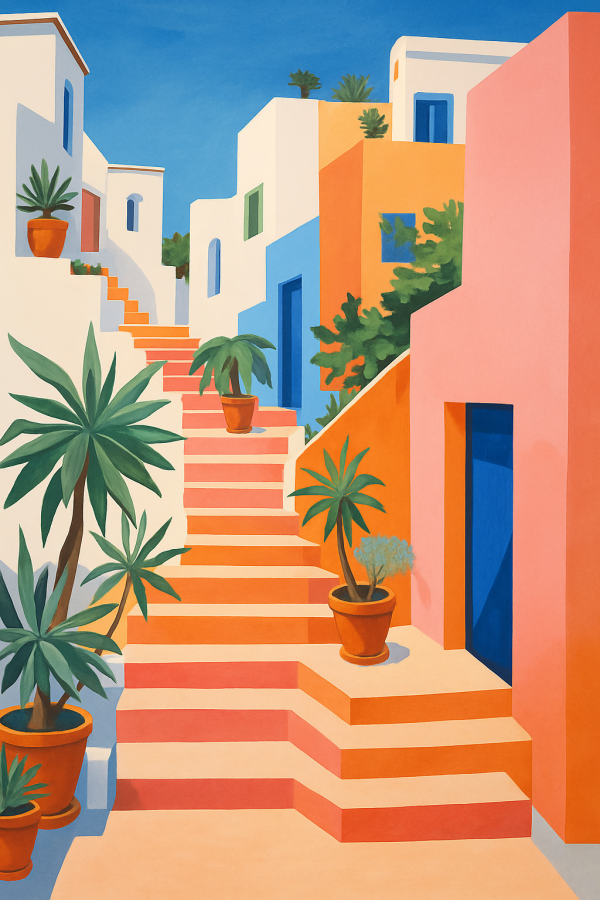 Ce tableau vibrant capture un escalier typique d’un village méditerranéen baigné de soleil, avec des façades aux teintes chaudes d’ocre, orange, saumon et blanc immaculé, contrastées par la profondeur du bleu azur des portes et du ciel. Les formes géométriques épurées et les lignes nettes créent un style moderne et minimaliste qui met en avant l’architecture simple mais élégante. Des pots de terre cuite remplis de plantes vertes luxuriantes, notamment des palmiers et autres feuillages tropicaux, ponctuent chaque marche, insufflant une touche de nature et de fraîcheur à l’ensemble. L’ensemble évoque la douceur d’une journée ensoleillée au bord de la Méditerranée, invitant à une promenade sereine dans une atmosphère paisible et chaleureuse. Le tableau installe une ambiance chaleureuse et accueillante, parfaite pour des intérieurs contemporains cherchant à évoquer la détente, le voyage et la beauté de la nature. C’est bien plus qu’un simple tableau, c’est une invitation à rêver d’évasion, d’aventure et de moments précieux au cœur d’un décor enchanteur. Parfait pour décorer un salon, un bureau ou une chambre, il s’adapte à une décoration tendance et personnalisable, tout en apportant une touche de magie méditerranéenne qui saura émouvoir et apaiser. Un cadeau idéal pour les amateurs de voyage, de nature et d’art moderne, ce tableau incarne la rencontre parfaite entre structure minimaliste et explosion de couleurs chaudes.