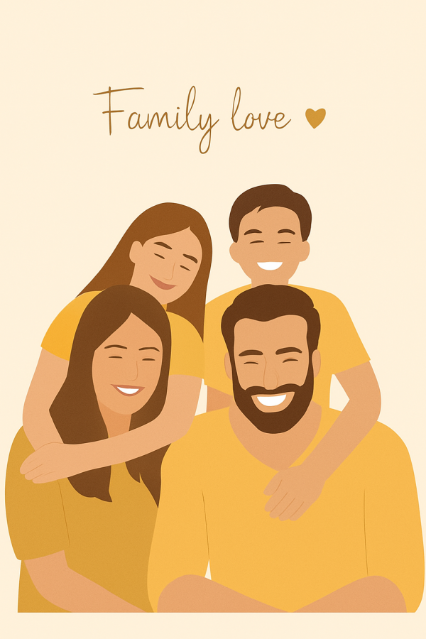 Cette affiche chaleureuse et moderne représente une illustration stylisée d’une famille unie, composée de quatre membres souriants, vêtus de tons jaunes et ocres, dans une ambiance douce et harmonieuse. Le dessin minimaliste, aux traits épurés et aux couleurs chaudes, évoque la tendresse et la complicité familiale, renforcée par le texte « Family love » accompagné d’un petit cœur délicat en haut de l’image. Les couleurs neutres et douces, associées à la lumière naturelle du décor, créent une atmosphère paisible et accueillante, parfaite pour un intérieur contemporain et cosy. Ce tableau raconte une histoire touchante d’amour, de bonheur partagé et d’affection profonde, invitant à célébrer les moments précieux passés en famille. Cette création artistique personnalisable s’adresse à ceux qui cherchent à immortaliser leurs liens affectifs dans un style moderne et élégant, faisant de ce tableau un cadeau original et porteur de sens. Il sublime la décoration intérieure en apportant une touche humaine et chaleureuse, idéale pour un salon, une chambre ou un espace familial. Mêlant décoration tendance, minimalisme et symbolique émotionnelle, ce tableau est une invitation au réconfort, à la joie et à la confiance, parfait pour transformer son espace en un havre de paix convivial.