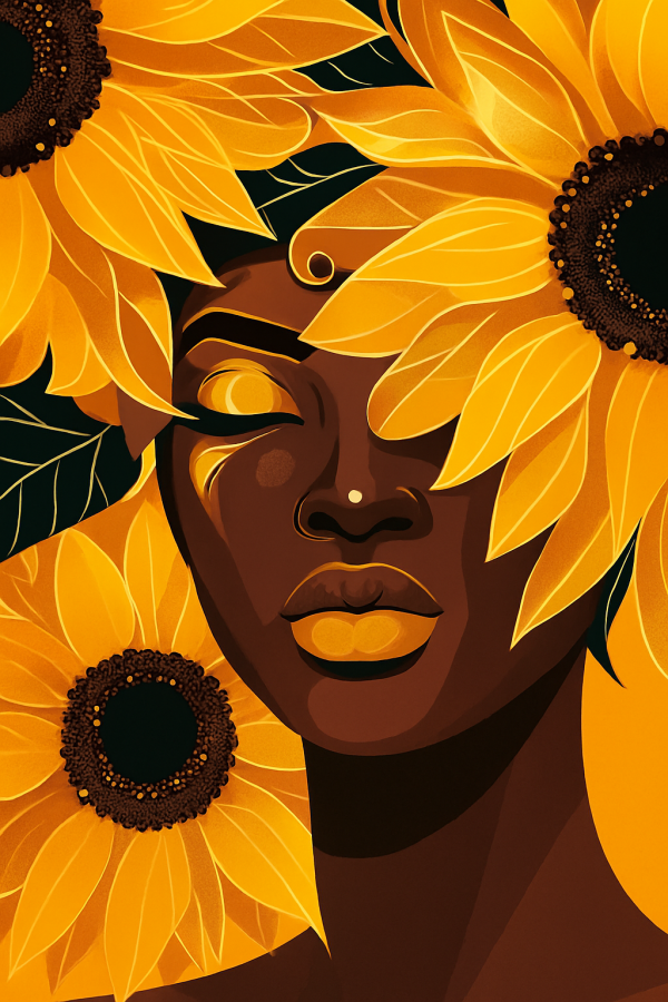 Ce tableau captivant présente le portrait stylisé d’une femme au teint profondément brun, encadrée par de grandes fleurs de tournesol éclatantes aux tons chauds d’orange et de jaune vif. Son visage serein, aux yeux fermés et aux lèvres subtilement accentuées, dégage une sensation de paix intérieure et de force tranquille. Le contraste entre la richesse des couleurs sombres de la peau et la luminosité des pétales crée une harmonie visuelle qui attire immédiatement le regard. Le style artistique, élégant et graphique, évoque une esthétique moderne combinée à une touche de nature et de chaleur solaire. Cette composition invite à une immersion dans un univers où la beauté, la nature et la féminité fusionnent en une seule image pleine de mystère et de douceur. Parfait pour insuffler une ambiance chaleureuse, apaisante et inspirante dans n’importe quelle pièce, ce tableau est une invitation au rêve et à la réflexion personnelle. Idéal pour une décoration tendance, il s’adapte aussi bien aux intérieurs modernes que bohèmes, apportant une touche de magie et d’énergie positive. C’est également un cadeau original qui évoque la connexion avec la nature, la force féminine et la sérénité, un véritable hommage à la beauté et à la diversité. Un objet décoratif à la fois artistique et porteur de sens, à découvrir sur Mycanva.fr pour embellir votre quotidien.