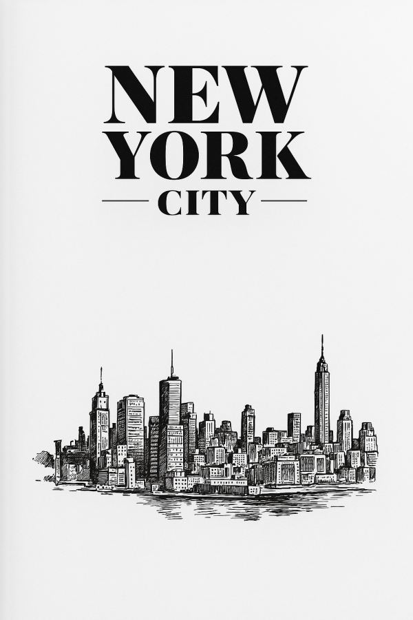 Ce tableau moderne et épuré présente une illustration en noir et blanc du célèbre skyline de New York City, offrant un rendu graphique élégant et minimaliste. La toile blanche, aux teintes lumineuses et neutres, met en valeur la silhouette détaillée des gratte-ciel emblématiques, dessinés avec précision dans un style gravure au trait fin. Le texte « NEW YORK CITY » en majuscules, dans une police classique et imposante, domine la composition et souligne l’identité urbaine forte de la ville. Cette création évoque immédiatement le dynamisme et le charme intemporel de la métropole new-yorkaise. L’ambiance générale est à la fois raffinée et contemporaine, parfaite pour apporter une touche citadine et design à un intérieur moderne. Idéal pour les amoureux de la ville, les voyageurs ou les passionnés d’architecture, ce tableau invite à rêver d’aventures urbaines et de nuits éclairées par les lumières vibrantes des gratte-ciels. Cette œuvre simple mais captivante fait également un cadeau original pour tous ceux qui veulent personnaliser leur décoration avec une touche d’élégance et de culture citadine sur Mycanva.fr.
