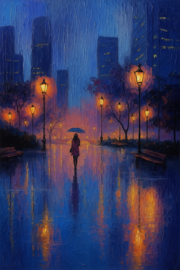 **1. Description artistique (≈ 120 mots)** : Cette toile contemporaine capture une scène urbaine nocturne baignée de tons bleu canard profonds, accentuée par les lueurs chaudes des lampadaires qui se reflètent sur une surface mouillée. Le style impressionniste évoque une ambiance mélancolique et apaisante, invitant à la contemplation. Le sujet central est une silhouette féminine sous un parapluie qui arpente un chemin bordé de bancs, tandis que les immeubles modernes en arrière-plan complètent cette décoration nature / végétale urbaine. L’effet de lumière crée un contraste saisissant entre le froid environnant et la chaleur des éclairages.