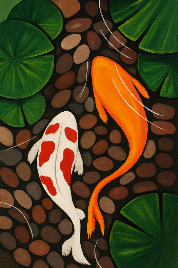 Ce tableau captivant illustre deux poissons koi évoluant délicatement dans un bassin apaisant. Le fond sombre, composé de galets ronds aux tons bruns et ocres, contraste harmonieusement avec les grandes feuilles vert émeraude de nénuphars qui encadrent la scène. Les deux poissons se détachent avec vivacité : l’un est d’un orange brillant vif et l’autre d’un blanc éclatant tacheté de rouge brique. Le style artistique est réaliste avec une touche contemporaine qui met en valeur les courbes fluides des poissons et les textures minutieuses des éléments naturels. L’ensemble crée une ambiance zen et méditative, évoquant la tranquillité et la sagesse des jardins japonais traditionnels. Cette œuvre invite à la contemplation et à la détente, transportant l’observateur dans un univers serein où la nature prend toute sa place, entre force et douceur. Parfait pour apporter une atmosphère chaleureuse et harmonieuse à tout intérieur, ce tableau est une invitation à ralentir et à s’évader. Il s’intègre idéalement dans une décoration tendance, moderne et naturelle, et constitue également un cadeau original et raffiné. Offrez-vous un instant de magie et de douceur avec cette création unique, parfaite pour les amoureux de la nature, de la culture asiatique et du bien-être au quotidien.