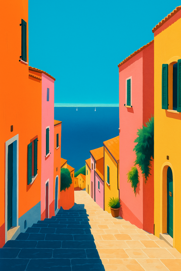 Ce tableau vibrant capture l’essence d’un village méditerranéen baigné de lumière et de couleurs chaudes. Les façades des maisons sont peintes dans des teintes éclatantes d’orange, de jaune et de rose, contrastant magnifiquement avec le ciel bleu azur et la mer en arrière-plan. Le pavé est représenté avec des nuances de beige clair et de bleu foncé, créant un jeu d’ombres et de lumière qui accentue la perspective descendante de la rue. L’ambiance générale évoque la douceur de vivre, l’évasion et la chaleur d’un après-midi ensoleillé, invitant à la promenade et à la contemplation. La composition graphique, détaillée mais lumineuse, évoque un style artistique contemporain avec une touche de réalisme minimaliste. Chaque élément — fenêtres ouvertes, pots de fleurs et reflets de lumière — contribue à un univers enchanteur qui invite à rêver d’un été éternel au bord de la mer. Cette œuvre transmet une sensation de paix et de joie simple, parfaite pour créer une ambiance chaleureuse et accueillante. Idéal pour une décoration tendance, ce tableau est également un cadeau original pour les amateurs de voyages, de nature et d’art coloré. Un hommage vibrant à la magie d’un lieu où la beauté de la nature se mêle à la magie de la vie quotidienne.