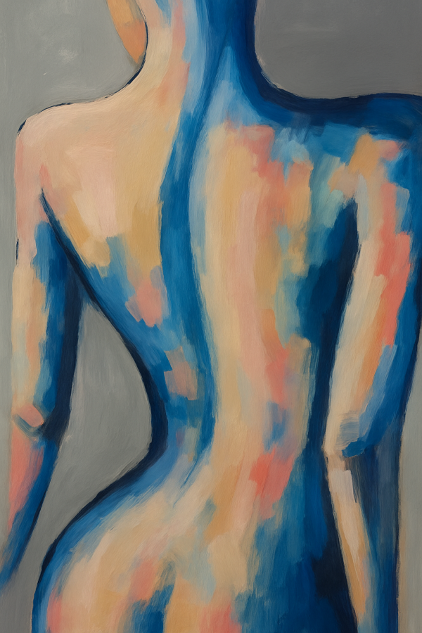 Ce tableau captivant présente une silhouette féminine de dos dépeinte dans un style abstrait et moderne. Les couleurs principales sont des nuances de bleu profond, de beige chaud et d’orange pâle qui se fondent délicatement les unes dans les autres, créant une harmonie visuelle douce et apaisante. L’arrière-plan gris neutre met en valeur la forme féminine tout en renforçant l’aspect contemporain du tableau. La peinture, aux larges coups de pinceaux subtils et stylisés, évoque une touche d’expression artistique libre, presque impressionniste, qui invite le spectateur à ressentir plus qu’à analyser. L’effet global offre une ambiance à la fois chaleureuse et mystérieuse, parfaite pour sublimer un intérieur moderne et épuré. Ce tableau évoque la beauté, la douceur et la force féminine, plongeant l’observateur dans une atmosphère contemplative et intime. On y perçoit une invitation à l’évasion, à la reconnexion avec soi-même et à la célébration de la silhouette humaine avec poésie. Cette œuvre artistique est idéale comme cadeau original, et elle saura apporter une touche d’élégance et de sophistication à tout salon, chambre ou bureau. Parfait pour les amateurs d’art abstrait, moderne et émotionnel, ce tableau sur toile est aussi une décoration tendance qui ajoute caractère et chaleur à votre espace de vie, tout en insufflant une ambiance douce et inspirante pour des instants de relaxation et de rêverie.