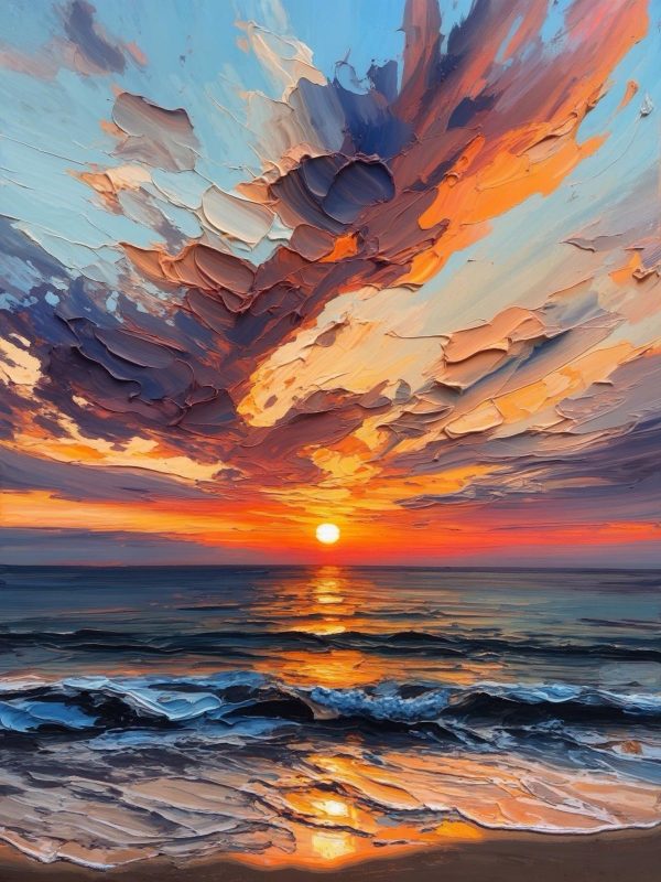 Cette œuvre sur toile déploie un somptueux coucher de soleil marin où le ciel brûle de teintes orange flamboyant, pourpre délicat et bleu profond. Les coups de pinceau, libres et dynamiques, esquissent des nuages stylisés qui semblent danser au-dessus d’une mer miroitante, tandis que des reflets lumineux se répercutent en douceur sur les crêtes des vagues. La ligne d’horizon se fond dans la composition, invitant à la rêverie et à la contemplation. Le rendu texturé, obtenu par un subtil empâtement, et la palette chaleureuse créent une atmosphère à la fois apaisante et vibrante, évoquant la force tranquille de l’océan et la magie d’un instant suspendu. Mélange d’impressionnisme et de touche contemporaine, cette toile vivante et expressive transforme votre mur en une fenêtre ouverte sur l’infini.
