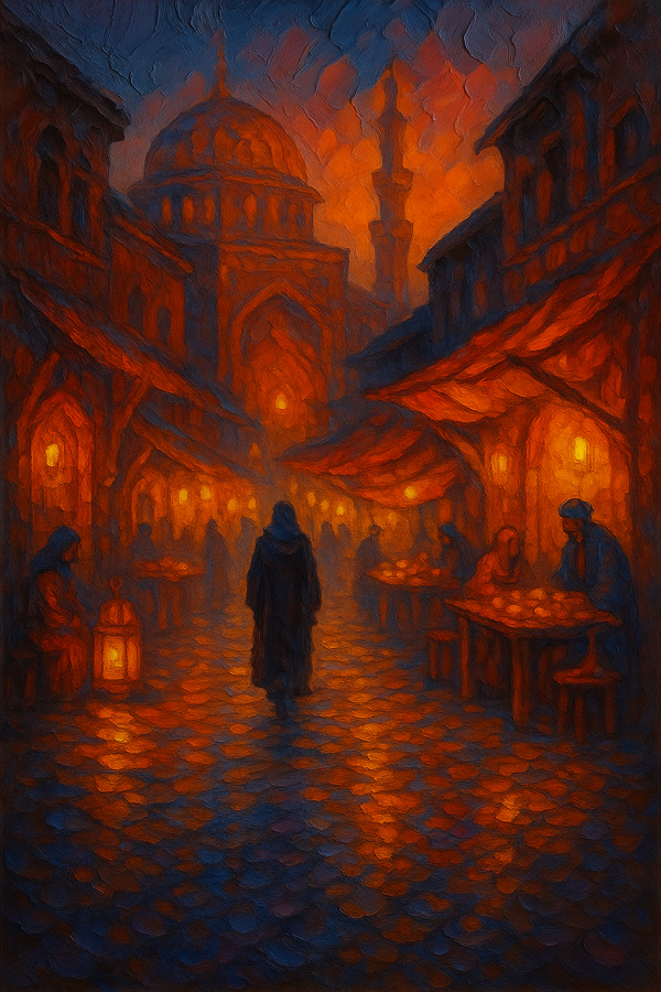 Cette œuvre puise son inspiration dans les marchés nocturnes d’Istanbul et Marrakech, où la magie des lanternes orange se mêle à l’architecture millénaire. Inspiré par l’art moderne et les courants orientalistes du XIXe siècle, ce paysage nocturne revisité allie tradition et audace contemporaine. L’artiste s’imprègne des ambiances méditerranéennes pour créer un tableau à la fois évocateur et actuel, célébrant le charme mystérieux des ruelles pavées et l’éclat des lumières tamisées, pour une expérience visuelle riche en émotions.