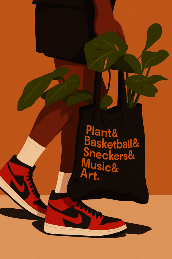 Ce tableau contemporain illustre un style graphique épuré et coloré avec une palette chaude dominée par des nuances d’orange brûlé et de noir profond. On y voit les jambes d’une personne vêtue de baskets rouges stylées, de chaussettes blanches, et portant un sac en toile noir orné d’un texte original énumérant « Plant & Baskelball & Sneckers & Music & Art. ». Le sac déborde de feuilles vertes luxuriantes qui créent un élégant contraste naturel avec les tons chauds environnants. L’ambiance générale dégage une atmosphère trendy et urbaine, renforcée par un style minimaliste mais vivant, qui lie harmonieusement culture streetwear, passion pour le basketball, amour des plantes et art. L’œuvre invite à une interprétation moderne du mode de vie citadin où la nature, le sport, la musique et la créativité coexistent pour inspirer un équilibre dynamique et stylé. Elle suscite une sensation d’énergie décontractée, de liberté d’expression et d’authenticité. Ce design captivant apporte une touche décorative moderne idéale pour un intérieur au style loft ou une pièce à vivre chaleureuse. Parfait pour les amateurs de décoration tendance, ce tableau est une idée cadeau originale pour ceux qui apprécient le mélange d’urbanité et de nature, ainsi que l’expression graphique contemporaine unique. Une œuvre d’art qui met en valeur la joie de vivre créative tout en apportant une note chaleureuse et équilibrée à votre espace.