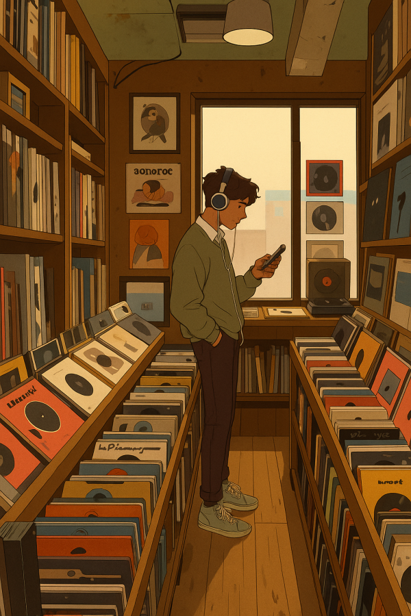 Ce tableau captivant dépeint une scène chaleureuse et nostalgique dans un univers musical rétro, baigné de tons chauds tels que le marron, le beige et l’ocre. L’œuvre représente un jeune homme en train d’écouter de la musique avec un casque audio, plongé dans une boutique de vinyles soigneusement rangés. Les rayons de bois, les pochettes colorées des disques vinyles aux teintes chaudes et les illustrations d’oiseaux stylisés sur les murs contribuent à créer une ambiance enveloppante, presque intimiste. L’éclairage tamisé confère une atmosphère cosy et invitante, rappelant un instant suspendu où le temps s’arrête pour laisser place à la découverte musicale et à la détente. Cette scène donne vie à un monde où la passion pour la musique ancienne et le vintage est célébrée avec douceur et authenticité. Chaque détail évoque une histoire d’exploration sonore, d’évasion et de souvenir aimé. Parfait pour embellir un intérieur avec une touche nostalgique élégante, ce tableau est un véritable hommage à la culture des vinyles et à l’art de la contemplation musicale. Idéal pour les amateurs de décoration vintage et pour créer une ambiance chaleureuse et inspirante, ce tableau Mycanva.fr est une idée cadeau originale et personnalisable pour les mélomanes et passionnés d’art graphique.